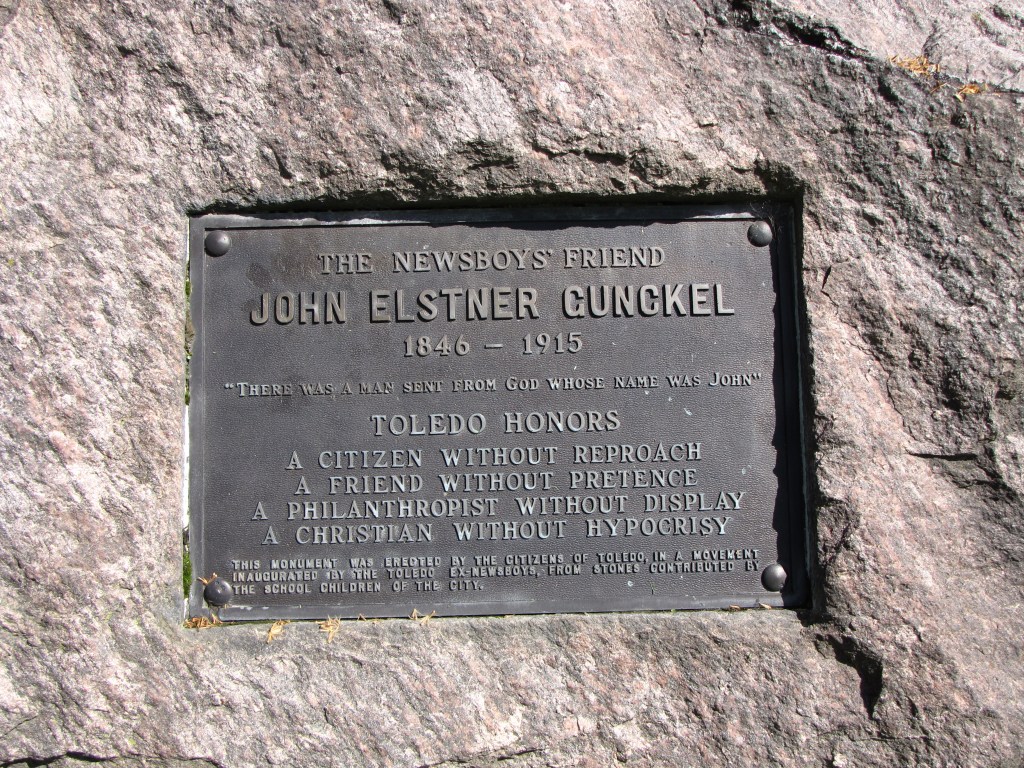 The copper plaque on the front of the pyramid, commends John Gunkel with high praise from the citizens of Toledo. His work all began after a seemingly kindly woman offered to help the city’s bootblacks and newspaper boys save and invest their money emptied their bank account and absconded with the money. The boys’ lifesavings were gone—she had cheated them.