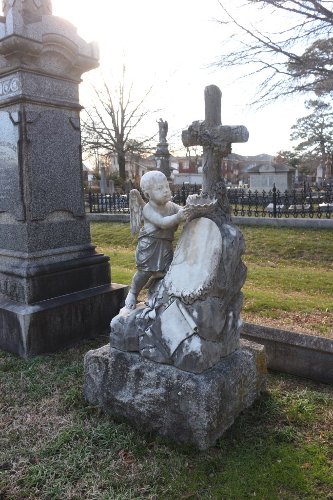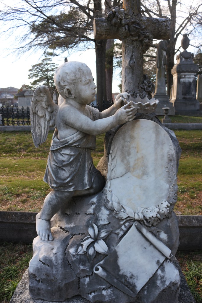 The monument depicts a winged cherub standing on rock base. The cherub is placing a crown above an oval cartouche below a rustic cross decorated with a wreath of flowers. The cartouche has a bow at its base with oak leaves and acorns twining up the right side and laurel leaves up the left, but the oval has no inscription. The oak leaves and acorns are seen as a traditional symbol of strength while the laurel leaves symbolize victory over death. Below the oval is an unfurled scroll, also empty.