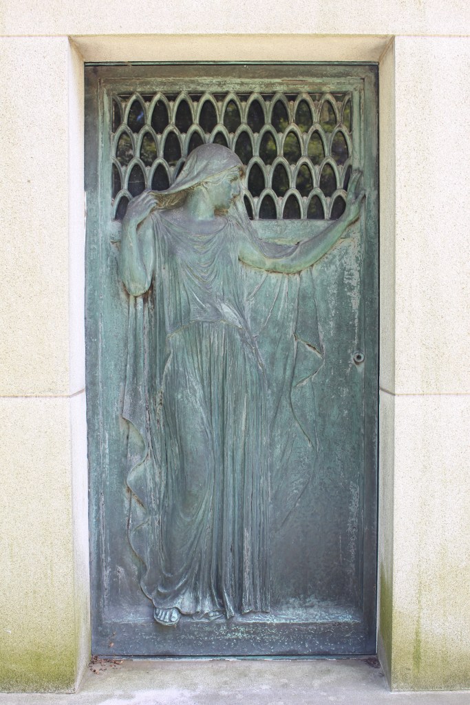 The door below was created for the Waller Mausoleum in Woodlawn Cemetery in the Bronx, New York.  The door depicts a classically dressed and draped mourning figure standing with her head bowed, tentatively waiting in somber silence.