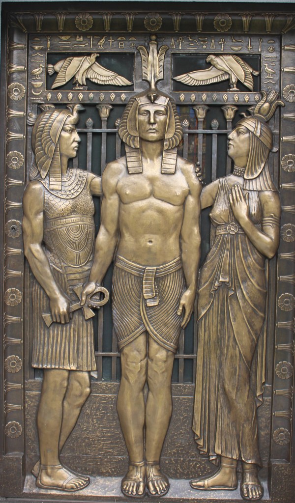Thanks for featuring this artist, as I never heard of him! If I were to live in a tiny house, I would like it to look like the Winter mausoleum. The male figure on the left “receiving the blessing” from the Ankh is wearing a goose headdress, which should make him Geb, God of the earth. The middle figure (Mr. Winter?) seems to be a Ptolemaic version of a pharaoh (or Osiris), and the female is wearing what looks like a stylized Isis headdress–two cow horns, sun disc, a couple of plumes, and a vulture. Love it.