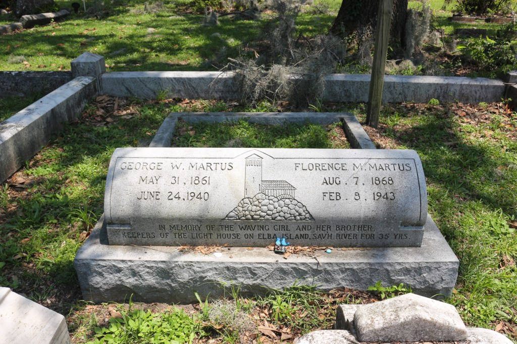 But after further research, what I found out is that that fanciful tale is not, in fact, true. It does sound terribly romantic, and you can imagine how a story like this got started as the story of the Waving Girl was told and re-told. There is a lot of truth in the story. Florence did live on Elba Island with her brother, George. They took over the care of the lighthouse when their father died. And Florence did wave at passing ships—from 1887 until 1931! But, according to Savannah’s Monuments: The Untold Stories by Michael Freeman, published by Schiffer Publishing, Ltd., page 59, Florence gave an interview late in her life where she dispelled the myth that had grown up around her, “That’s a nice story. But what got me started…I was young and it was sort of lonely on the island for a girl. At first I would run out to wave at my friends passing, and I was so tickled when they blew the whistle back at me…”