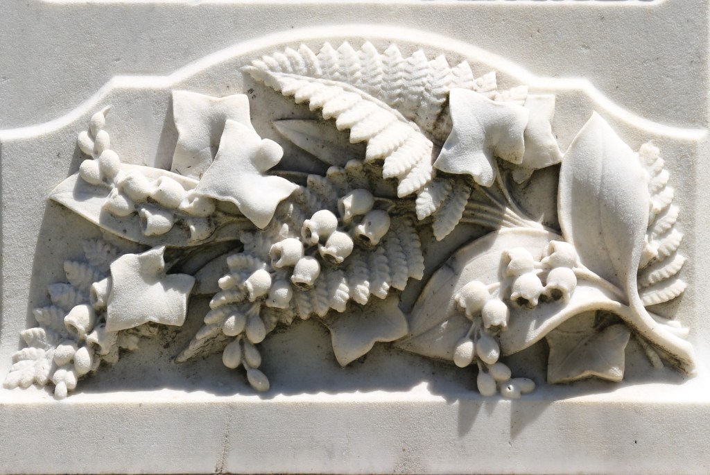 The segmented top white marble gravestone of James Cousins in the Old City Cemetery in Sacramento, California, is festooned with flowers and foliage—lily of the valley, ferns, and ivy—each with meaning.