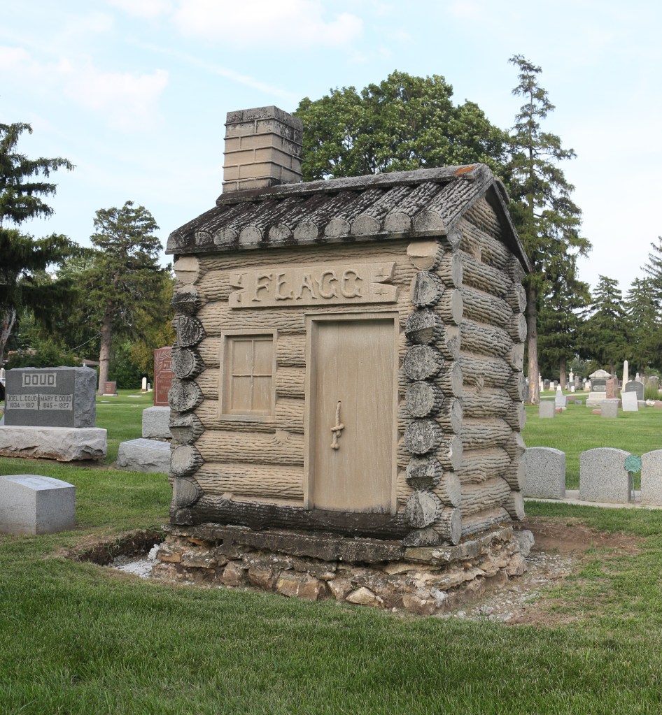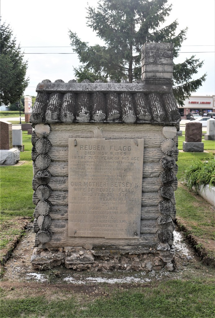 According to the trade magazine publication, Monument Reporter, December, 1909, Volume 42, Issue No. 12, published by Nichols and Co., Chicago, Illinois, page 13, the Flagg monument was a “unique monument erected at the Plainfield, Cemetery, Plainfield, Ill. For George Flagg, in memory of his father and mother, Reuben A. Flagg and his wife. This job was cut out of one solid piece of Indiana buff Bedford stone. It is 5-0 x 4-0 x 7-2 to the top of the chimney and weighs 15,000 pounds. It required six horses to haul it from the depot to the cemetery. Mr. and Mrs. Flagg were one of the first four families in Will County and always lived in a log cabin of this style; and that is why this monument was especially designed for them by Arthur Wunderlich of the E. Wunderlich Granite Co., Joliet.”
