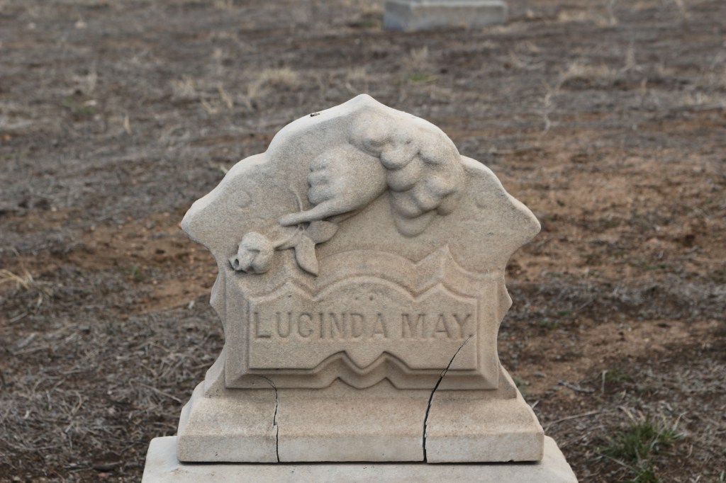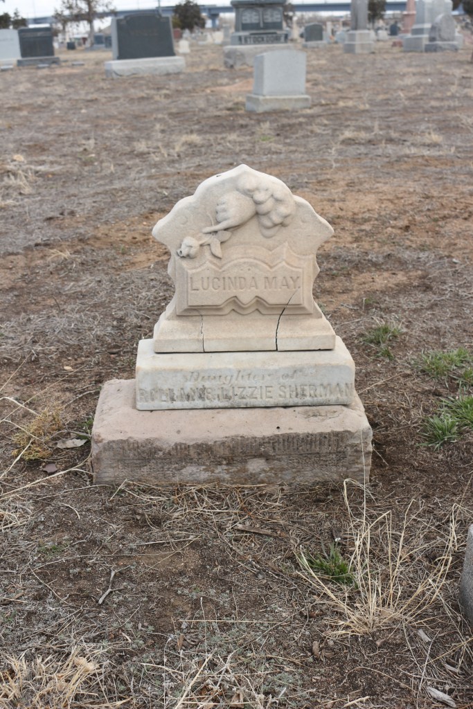 For nearly a thousand years, artists depicted God as a hand reaching down from the clouds. Such a representation of God can be found on Lucinda May Sherman’s small white marble gravestone in the Riverside Cemetery in Denver, Colorado. Often this symbol on a gravestone meant that the deceased had died unexpectedly or abruptly, as was the case for two-year old Lucinda May.