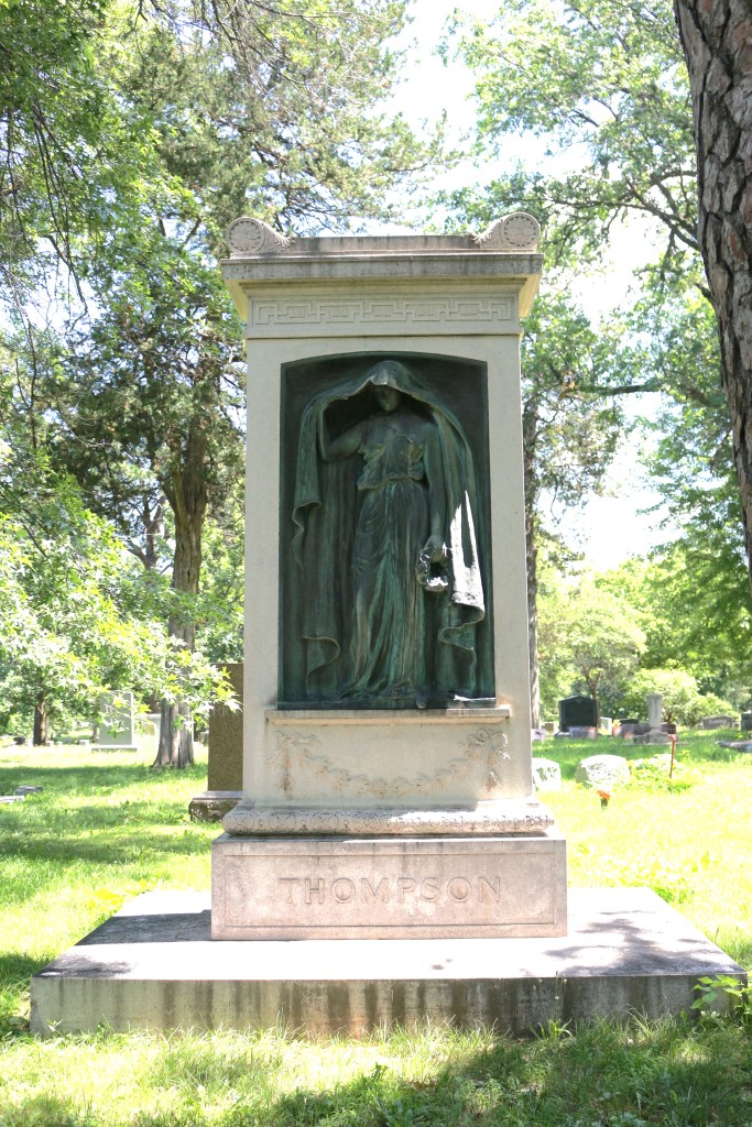 Thompson commissioned Fred L. Kimball, a noted Nebraska artist, to create the Thompson family monument. The sculpture was cast at the Jno Walters Foundry in New York. The monument is comprised of pink granite and has a life-size bronze relief sculpture in the center depicting a mourning figure lifting part of her garment over her head to form a veil. The veil represents the partition that exists between the Earthly realm and the Heavenly one–between life and death. In her other hand she is clutching a floral wreath. This is a common Victorian funerary symbol expressing the transitory nature of life. D. E. Thompson died in 1942 in Southern California. His remains were cremated and interred at the family plot.