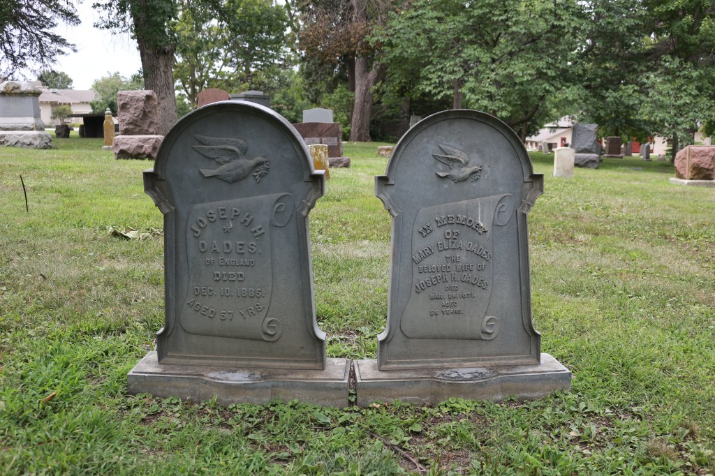 According to the booklet, Wyuka Cemetery: A driving & Walking Tour, page 70, written by Ed Zimmer, published in 2009 by the Wyuka Historical Foundation, “The Oades were born in England and immigrated to Lancaster County through Canada. Mary Eliza was only 29 years old when she died in 1871, just two years after the founding of Wyuka. Mr. Oades was suffering from “St. Vitus’s dance” a neurological disease that causes uncontrollable movements, when he took his own life at age 57 in 1885.”