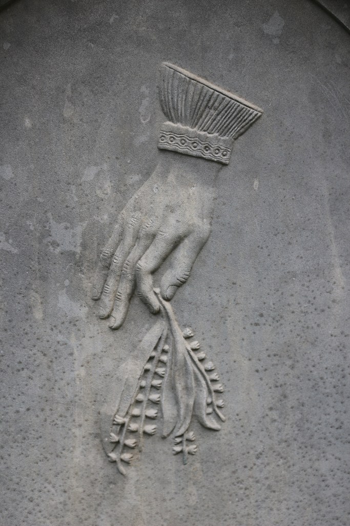 The back of the markers features a woman’s hand holding a lily of the valley sprig. The lily of the valley is much like other lilies in funerary art and viewed as a symbol of innocence and purity.