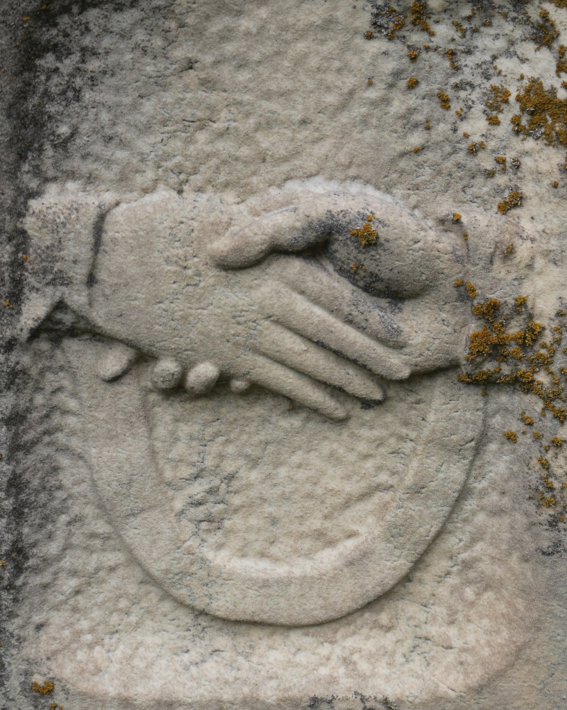 Some gravestones depict the hands descending through the clouds—the clouds symbolizing Heaven. This motif likely represents a final farewell or eternal bond between the living and the dead. The handshake may also represent God reaching down for the deceased to bring them into his presence as a welcome to Heaven—the Heavenly handshake.