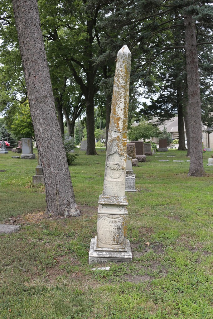 The titled and eroded white marble gravestone of Lovinia Bostater in the Wyuka Cemetery in Lincoln, Nebraska, displays one of the most common Victorian motifs found in American cemeteries—clasping hands.