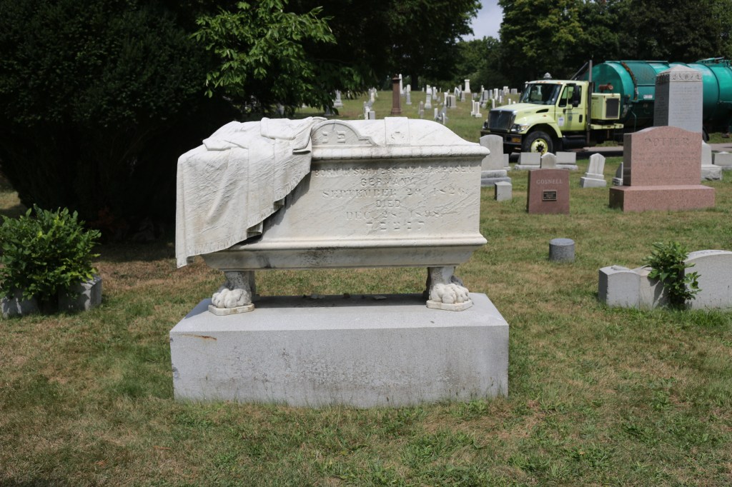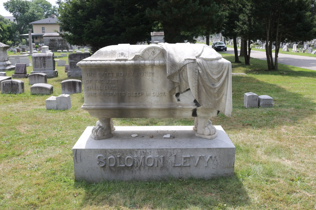 The Solomon Levy monument in the Mount Hope Cemetery in Rochester, New York, is a white marble sarcophagus—and a potpourri of symbolism. The sarcophagus as a gravestone form is an ancient burial monument designed to look like a coffin. This tomb is embellished with ornamentation and draped with a funeral pall held up with lion’s feet resting on a light gray granite block. But the “coffin” is empty–just an empty symbol of the receptacle.