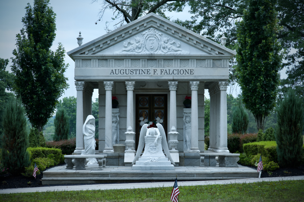 A statue of the Madonna (?) on the left and a fine reproduction of William Wetmore Story’s 1894 Angel of Grief at center might be proxies for Falcione’s widow, who has humbly refused to place her name on the exterior of this complex so that it can be entirely about her beloved husband.