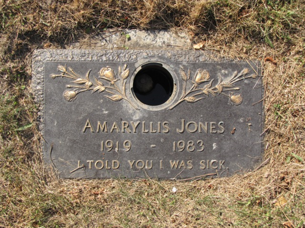Amaryllis Jones, who is buried in the Forest Lawn Cemetery in Buffalo, New York, also had the last word. Her epitaph reads, “I told you I was sick.” No mistaking that message; she wanted to remind those who she left behind that she was not complaining, this was not the typical ailment, that she was RIGHT, she was sick! Or, she had a good sense of humor.