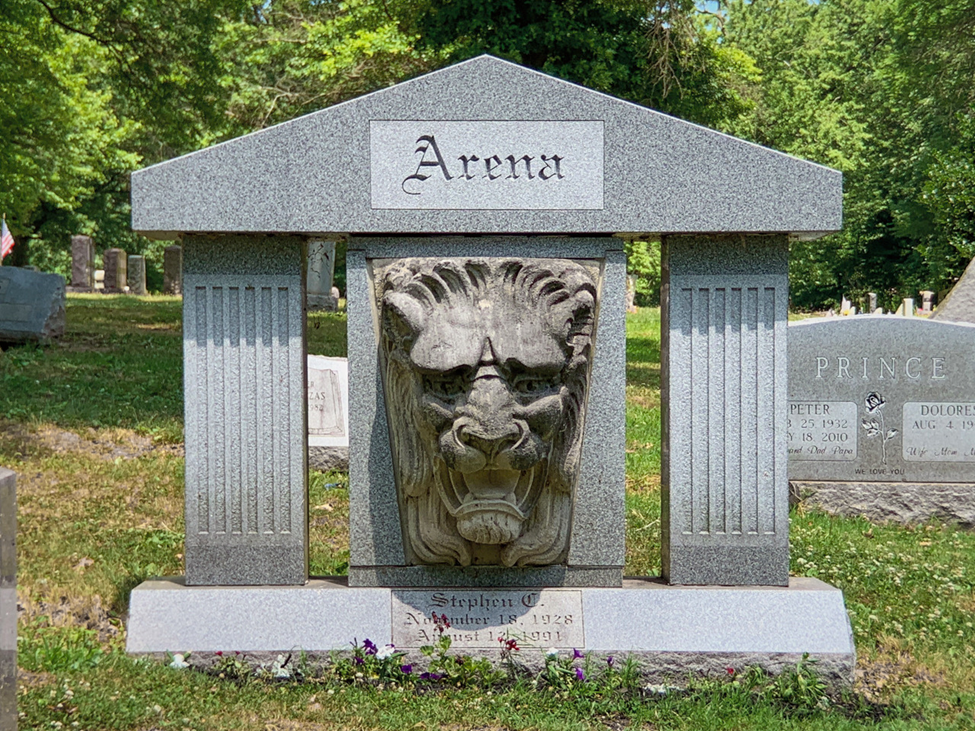 In Riverside Cemetery in Norristown, Pennsylvania, Stephen C. Arena has built a notable monument for himself, embedding an architectural fragment within a newly carved granite framework. The architectural fragment is the keystone of an arch in the form of a lion’s head. One imagines Mr. Arena rescued or collected it in the Robert Moses era when older American buildings were being torn down for the sake of beltways and modernization. Ours is a fierce lion, threatening us with a wide-mouthed snarl.