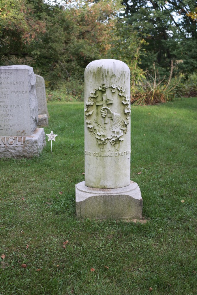 The column dedicated to George Albert French has two main symbols dominating the marker—the ivy tied with a bow into a wreath and, in the middle of the wreath, a hand holding a Latin cross. Both symbols, like many symbols found in cemeteries, have several different meanings.