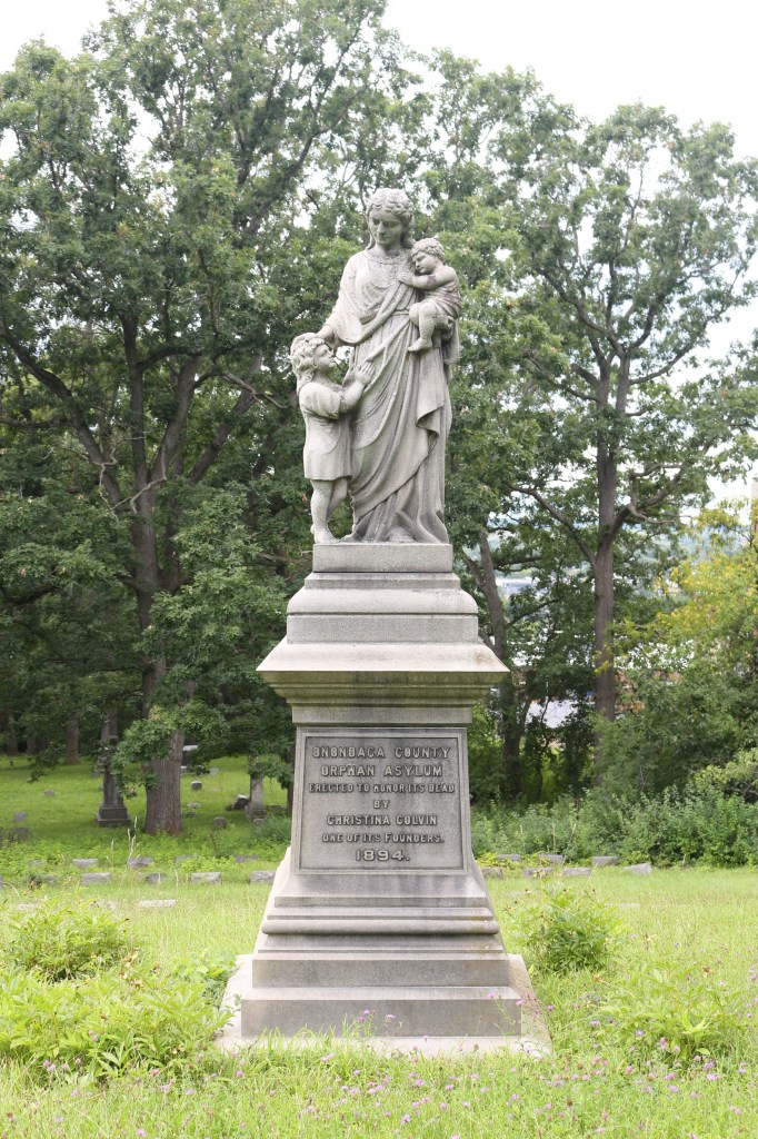 In the Oakwood Cemetery in Syracuse, New York, philanthropist Christina Colvin commissioned sculptor Ralph Cook (1847 – 1912) to create a monument to honor those orphans of the asylum who had died. According to the April 4, 1892 edition of the Syracuse Journal, Colvin’s “devotion to the Orphan Asylum has often stimulated others to follow her example. She labored for it in various directions … How large would be the pile of socks, stockings and mittens she knit till her lame, tired hands could knit no longer. She did good, as she had opportunity. Often stricken by sorrow, she strove in helping others to forget her own loneliness. Long connected with the Reformed church, whether she took the care and responsibility from less broad and experienced shoulders in her own social gatherings, greatly helping to ensure their success, or came into our homes with strong but tender hands and heartfelt sympathy in times of sickness and death, we all know we could trust dear “Aunt Tiny.”