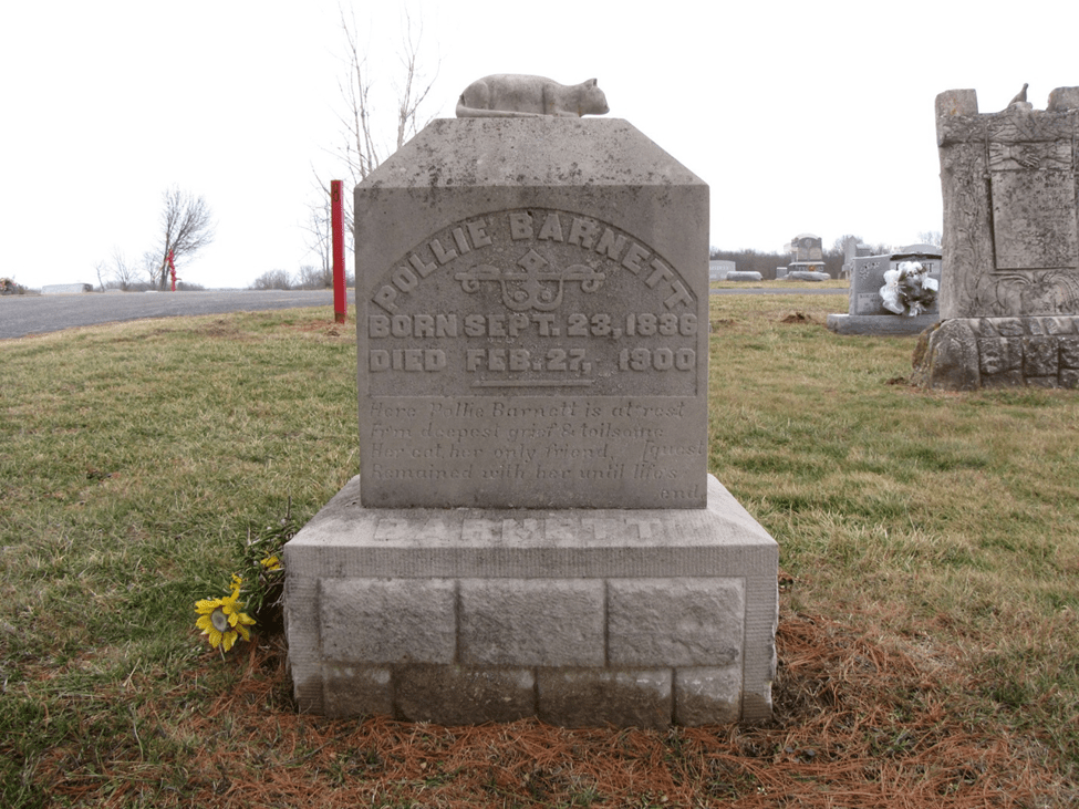 Whether dog and cat lovers can agree or not, graveyard aficionados can attest that many more dogs can be found on gravestones than cats. In fact, in my experience, I have seen very few cats adorning tombstones—so when I saw a gray marble cat perched atop the gravestone of Pollie Barnett in the Fairview Cemetery in Linton, Indiana, I was drawn to it. Then I was pulled in further by the following epitaph: