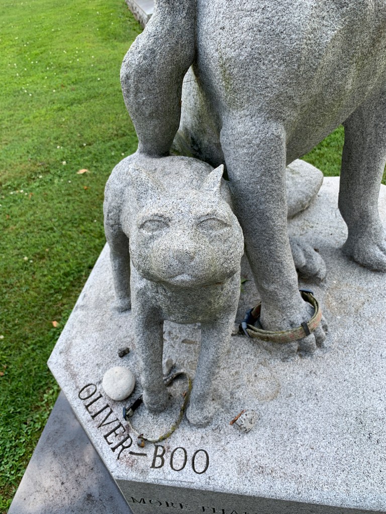 Both figures are stylized but imbued with personality. The cat is labeled with the name “Oliver-Boo,” and (like the dog, “Archie”) looks up at the cemetery visitor with a glance they might have shown in life. Oliver-Boo affectionately rubs against Archie, and both have had small offerings laid at their feet.