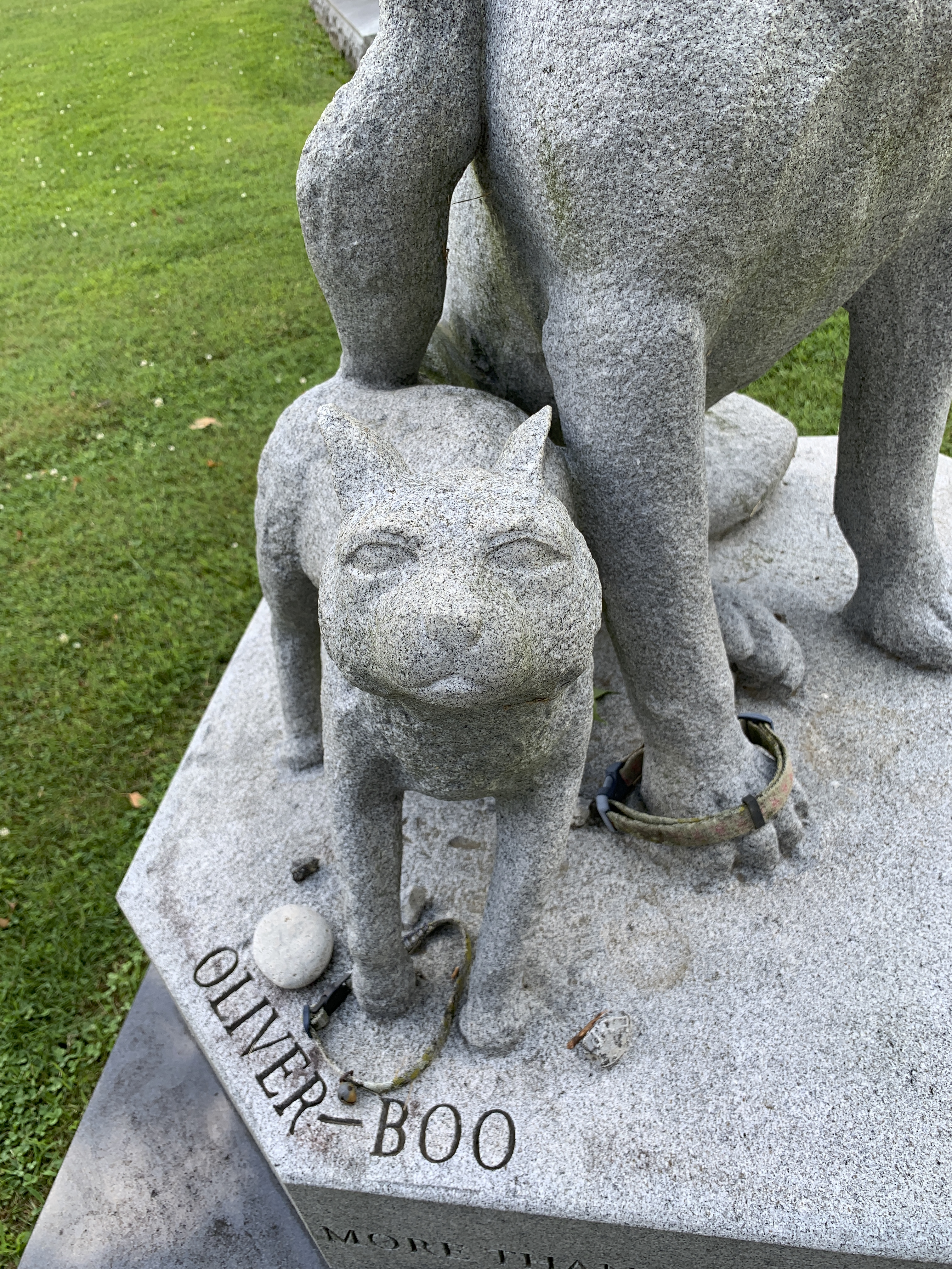 Both figures are stylized but imbued with personality. The cat is labeled with the name “Oliver-Boo,” and (like the dog, “Archie”) looks up at the cemetery visitor with a glance they might have shown in life. Oliver-Boo affectionately rubs against Archie, and both have had small offerings laid at their feet.