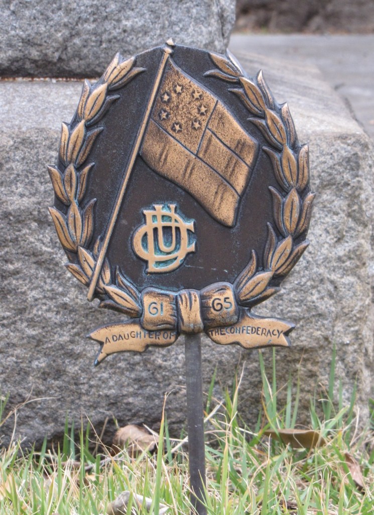 The metal marker is a replica of the emblem of the UDC. A laurel, gathered together with a ribbon with two dates 61 and 65, the beginning and ending of the war, surrounds a Confederate flag and the intertwined letters U D C.