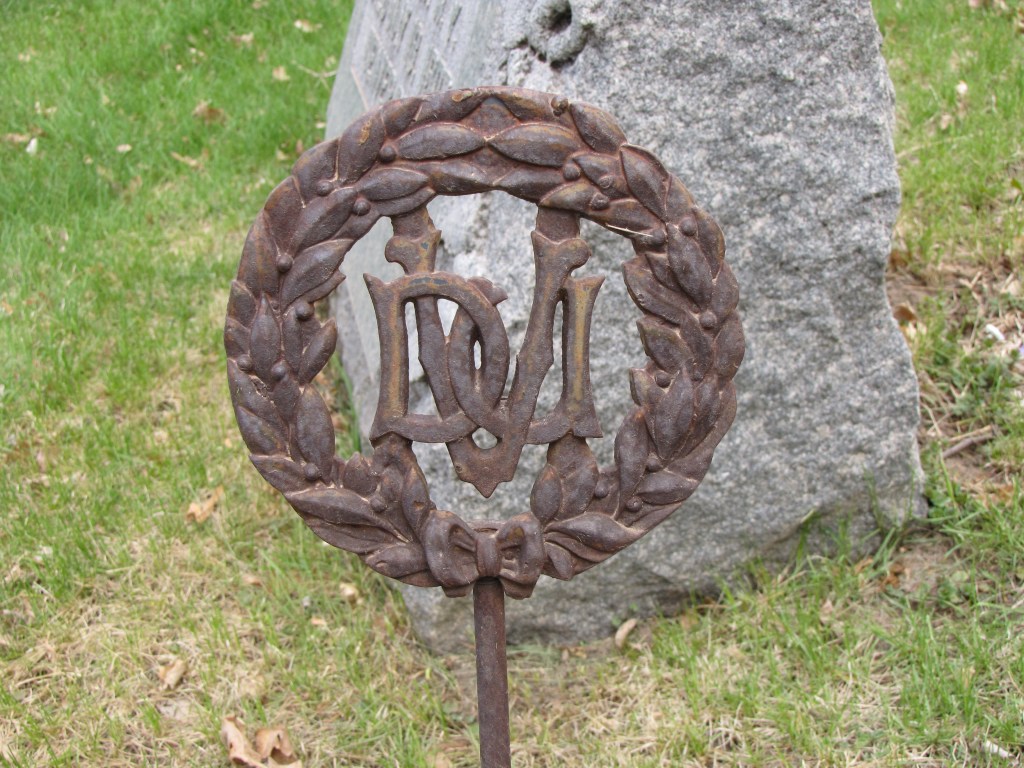 The metal marker is a replica of the organization’s insignia, a laurel wreath, surrounding the intertwined letters D U V. The laurel is a traditional symbol of victory and military glory from as far back as the times of the Romans.
