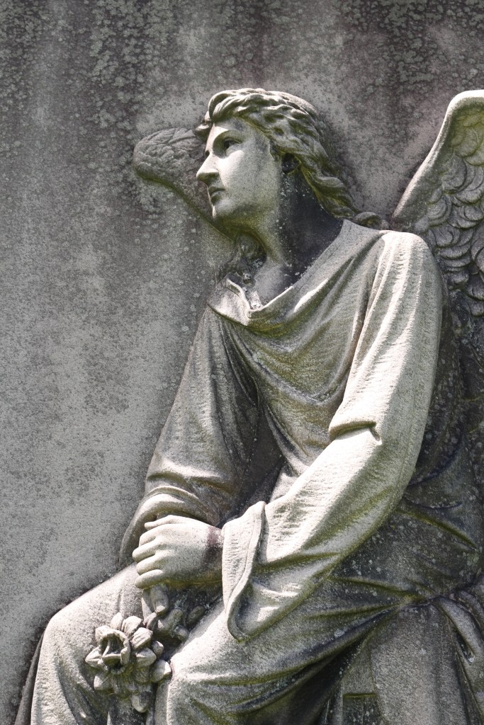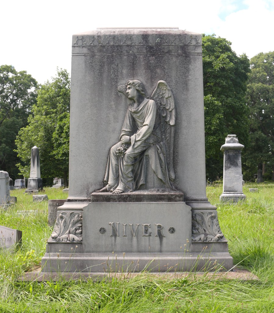 The Niver Family monument in the Oakwood Cemetery in Syracuse, New York, depicts a mourning figure—in this instance, an angel. We know it is an angel by its wings. Christian art began depicting angels with wings in the fourth century. Before then, angels were represented in several different forms–sometimes in human form, but they were also represented as a doves, or even as a hand reaching down from Earth from the Heavens. Beginning with the reign of Constantine, angels began being portrayed with wings, as is this figure, sullen with its eyes cast toward Heaven.