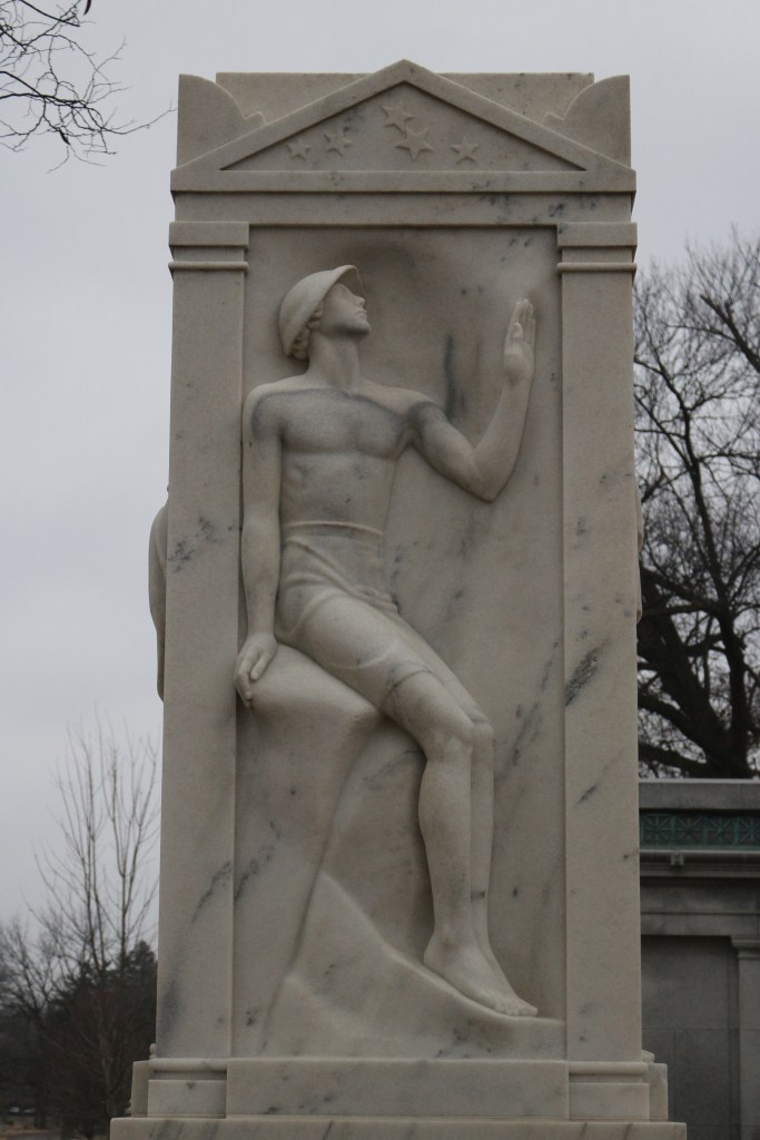 Each of four stages of his life is commemorated in a relief panel which sits on a hilltop in the Crown Hill Cemetery in Indianapolis.