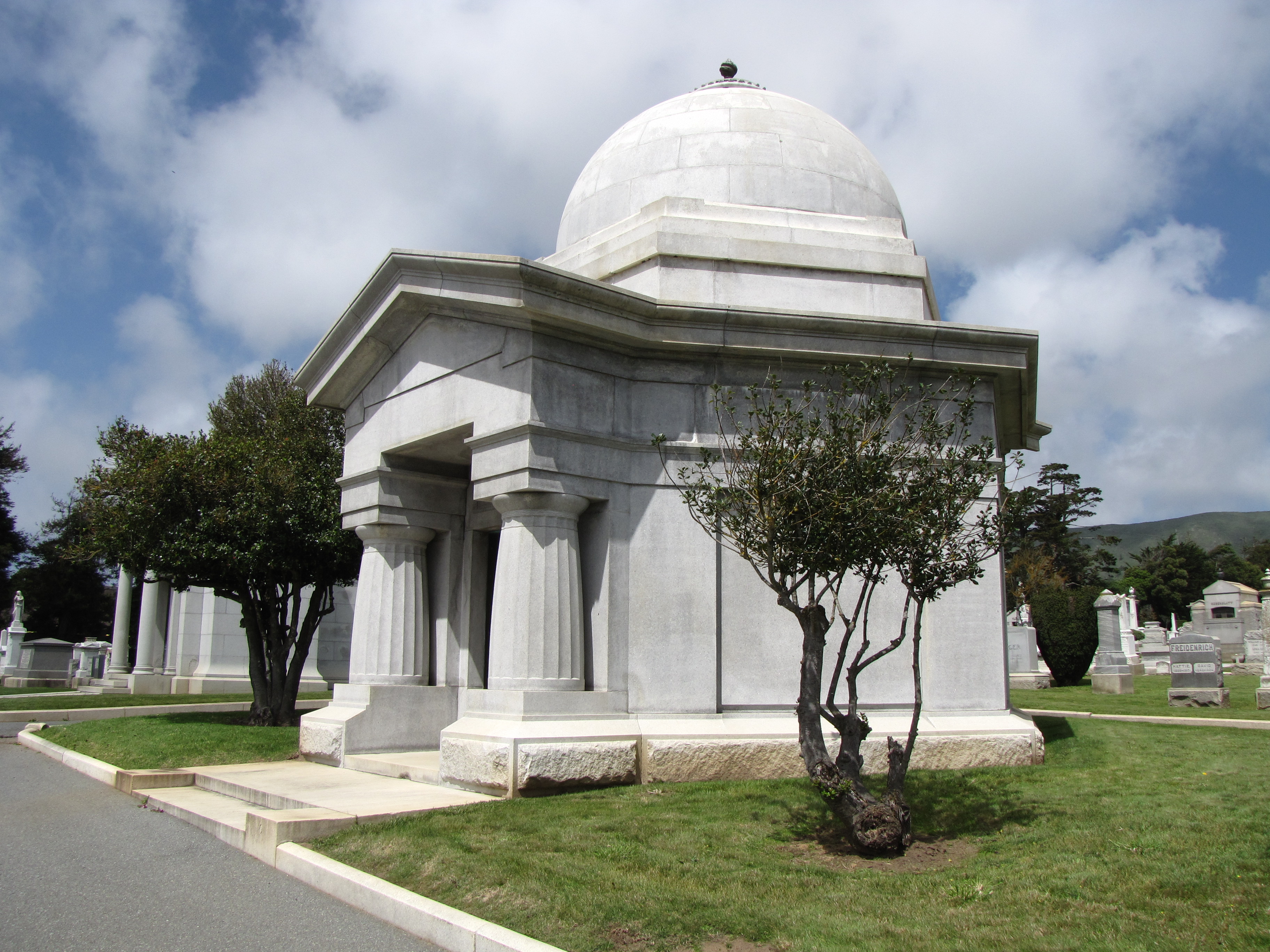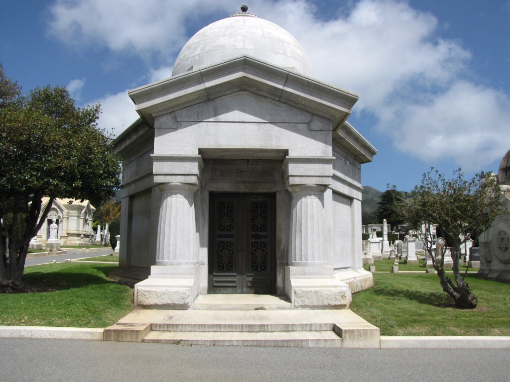 Levi Strauss, made famous and wealthy from innovative blue denim trousers strengthened with a rivet, built a massive family mausoleum in the Home of Peace Cemetery and Emanu-El Mausoleum in Colma, California.