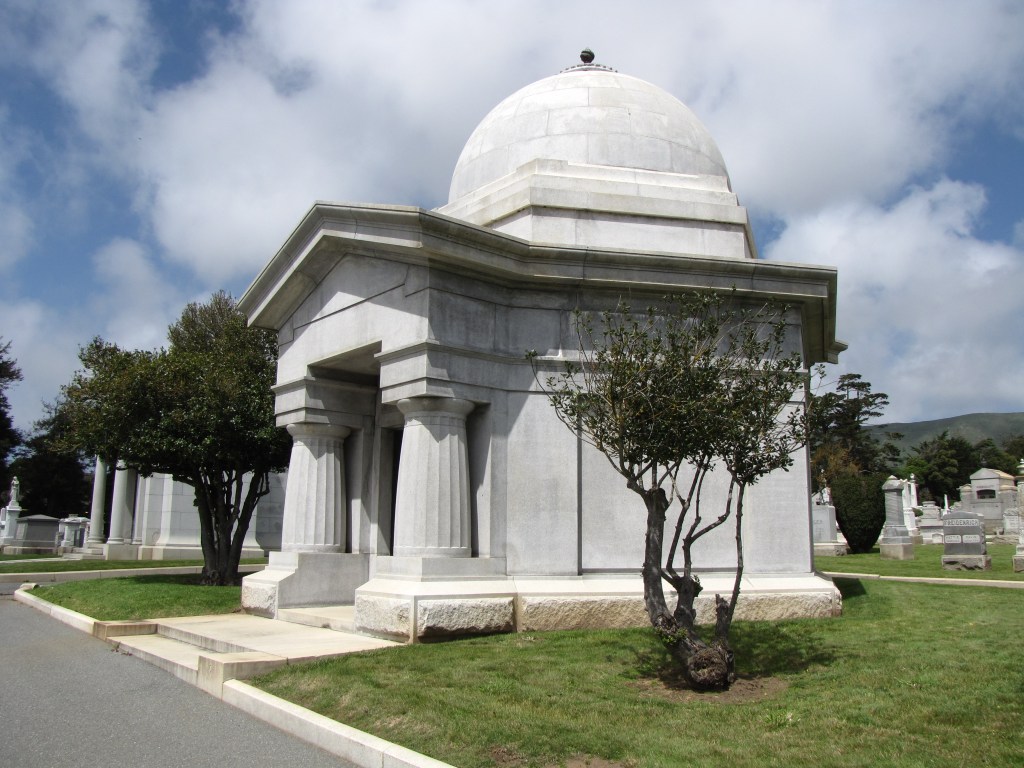 Strauss built a mausoleum made of a light Salisbury pink granite at the staggering cost of $48,000. The domed tomb has fluted Doric columns supporting a portico and flanking decorated bronze doors. Levi Strauss, who never married, left a fortune of nearly 900 million in 2025 dollars. He shares his tomb with his mother and other relatives.