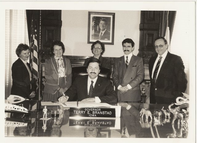 Taken March 20, 1986, Governor's Office, Des Moines, Iowa. Standing from left to right: two unidentified women, State Representative Johnnie Hammond, Douglas Rife, State Senator Jack Hester. Seated: Governor Terry E. Branstad.