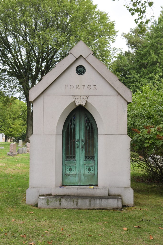 The pointed arch stained-glass window in the back of the Porter Mausoleum at the Homewood Cemetery in Pittsburgh, Pennsylvania, displays a flower in the center, which could possibly be a mayflower and a nod to his membership in the Society of Mayflower Descendants—Mr. Porter was an avid genealogist and descended from Mayflower Pilgrim Isaac Allerton.