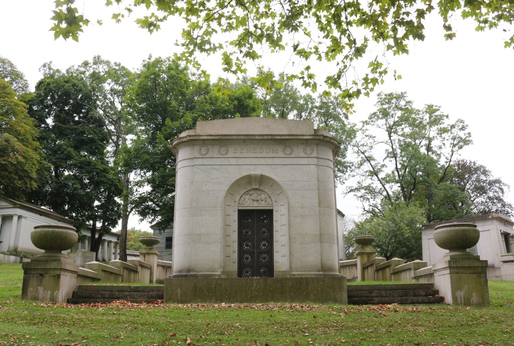The rounded arched stained-glass window in the back of the Renaissance Palazzo-style Benedum Family mausoleum at the Homewood Cemetery in Pittsburgh, Pennsylvania, likely depicts St. Michael, as he is shown wearing a sword.  Like much symbolism found in cemeteries, however, this could have a more personal meaning.  The Benedum’s only son was serving in Washington DC as a chemical warfare specialist when he contracted the influenza and died. This scene could possibly depict Lieutenant Claude Benedum, the Benedum’s only child, as a soldier being lifted to Heaven by the two winged angels flanking the figure.
