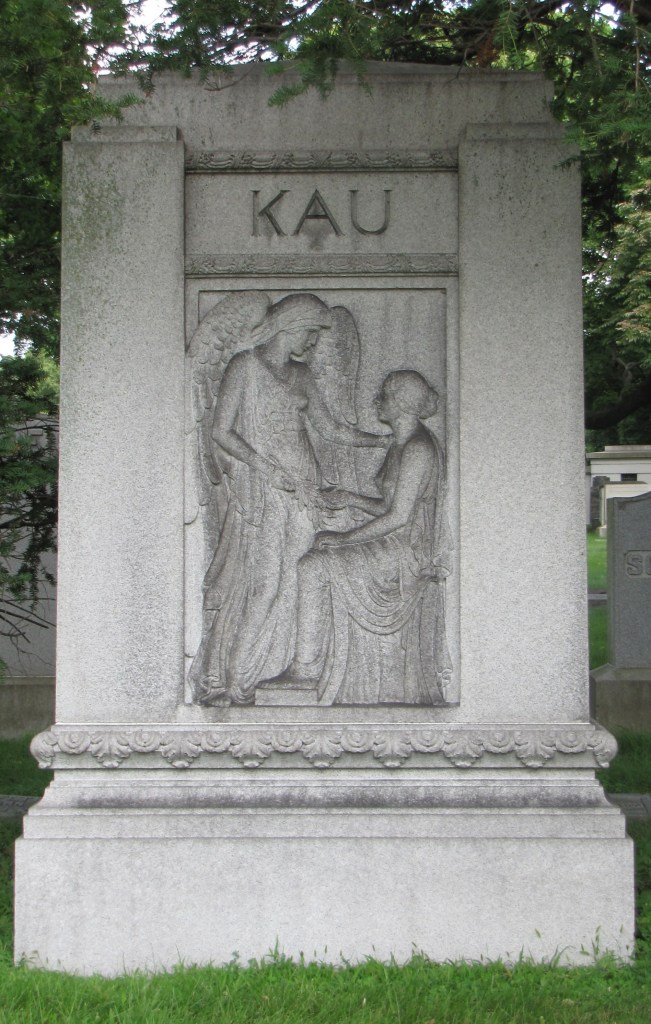 In this example, in the Rose Hill Cemetery in Chicago, Illinois, the Kau monument depicts a classically dressed soul-bearing angel standing in front of a seated woman.  The angel, a messenger of God, in a comforting moment touches the woman’s shoulder while offering her an olive sprig.  This seems to be the moment just before the angel and the woman ascend to Heaven. Here the olive branch likely symbolizes that the soul of the soon-to-be departed woman will leave in peace with God.  The olive sprig can also represent a desire for peace and harmony for the loved ones who are left behind.