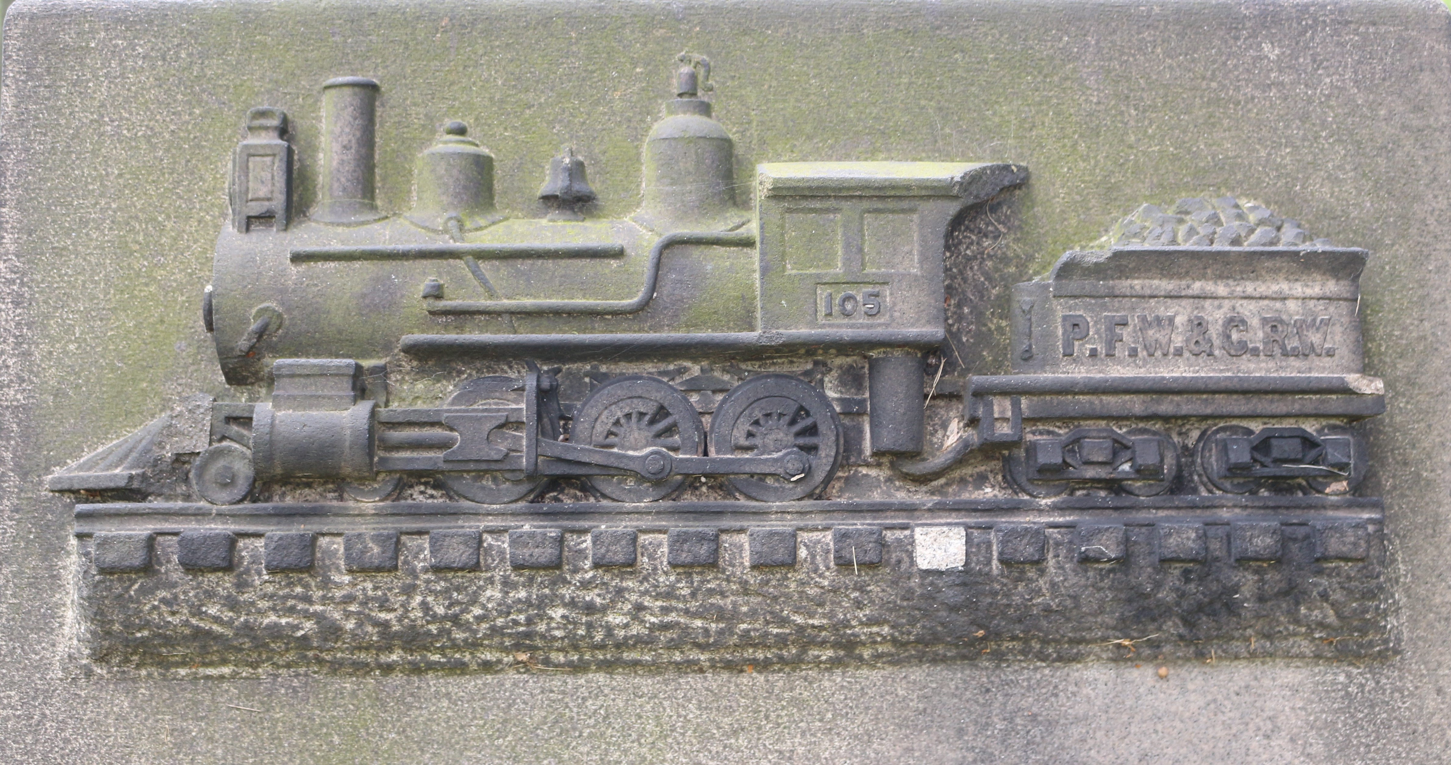 The small square-top tablet in the Union Dale Cemetery in Pittsburgh displays a bas-relief of a locomotive at the top of the gravestone—not just any engine, but the likeness of the Pittsburgh Fort Wayne & Cleveland Run Woods that killed Charles Haggerty in a trestle span collapse. The Monday, April 5, 1897 Pittsburg Press printed the following headlines: