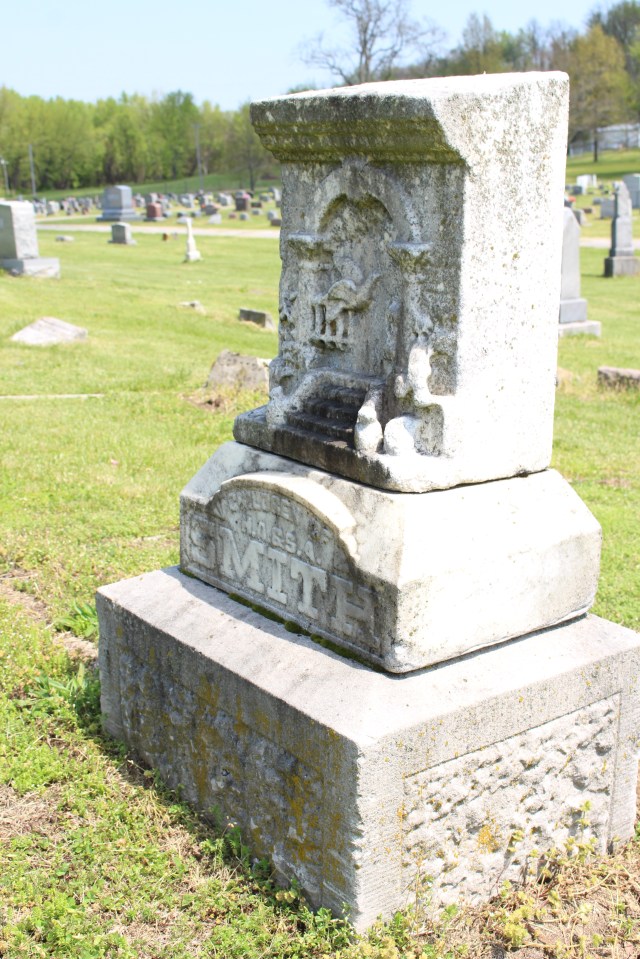 I recently went looking for the Upper Mound Cemetery just to the West of Covington, Indiana. Even though I located it on the map, I could not seem to find it. I stumbled upon the small and very well-kept Lower Mound or Mound Cemetery—but not what I was looking for. However, I did find a gentleman in the cemetery who gave me explicit directions to the Upper Mound Cemetery which, as it turned out, was only a mile or so away. In fact, on my way to Lower Mound, I had passed right by it. If it had not been for the directions from the stranger, I never would have located it. There is no signage and the side of the lane next to the county road that takes you up to the cemetery is tree-lined and overgrown, completely obscuring a view of the graveyard. It isn’t until you pull off the county road and look directly up the lane that you get a glimpse of gravestones that you know you are on the right track.
