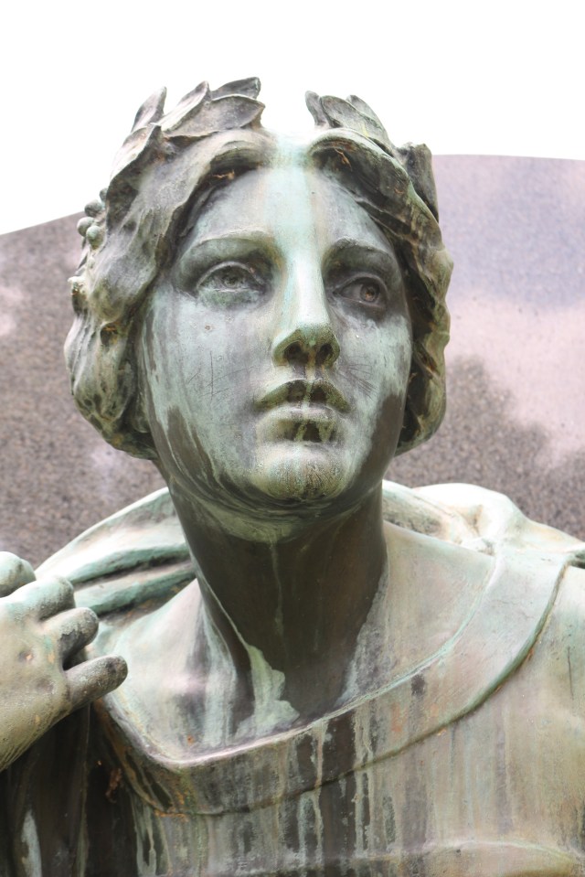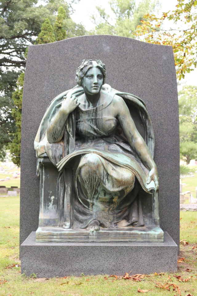 The bronze plaque to the right of the gate features a bas-relief depicting a woman leaning slightly back with both hands raised seemingly in awe with the rising sun behind her. Her feet indicate that she floats above the Earth. The inscription circling around the sun, reads, “I AM THE RESURRECTION AND THE LIFE, THIS MORTAL BODY IS RAISED TO AN IMMORTAL BODY.” Running down the side of the plaque is a Biblical passage, “THE DEAD SHALL HEAR THE VOICE OF THE SON OF GOD AND THEY THAT HEAR SHALL LIVE. JOHN V:25. Underneath that, “FOR THEY SHALL REST FROM THEIR LABORS HERE AND SHALL CONTINUE THEIR WORKS.” DOCTRINE AND COVENANTS, SEC.: 124:86.