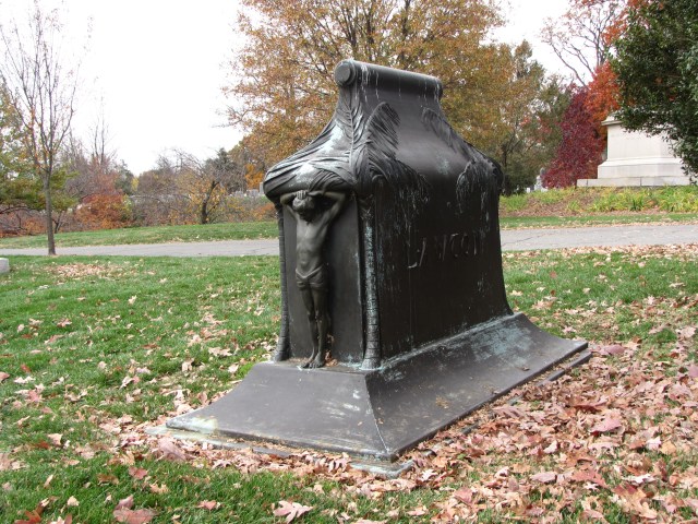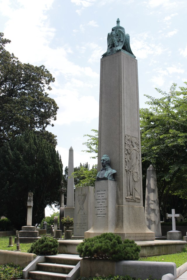 Tyler is buried in the famed Hollywood Cemetery in Richmond, Virginia. Tyler’s monument is a soaring granite shaft topped with a bronze urn with eagles back to back.