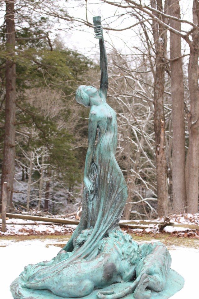 The other side of the column depicts an allegorical figure with her hand around a mace and in the other hand she holds a twig while balancing a shield bearing the seals of the United States and the Commonwealth of Virginia.