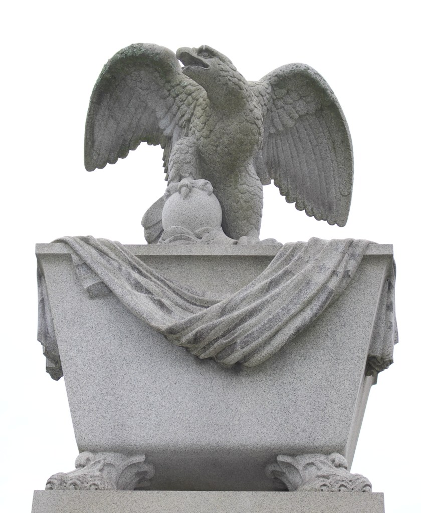 This monument is topped with an eagle standing on a flag-draped sarcophagus. An eagle often represents the Fraternal Order of Eagles, but in this case the eagle connotes service in the military.
