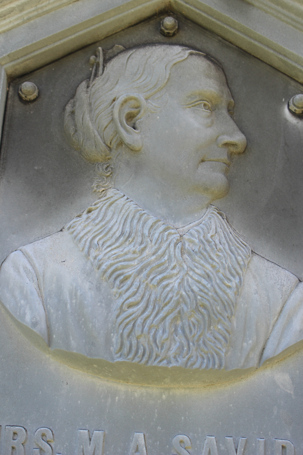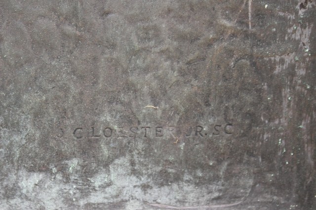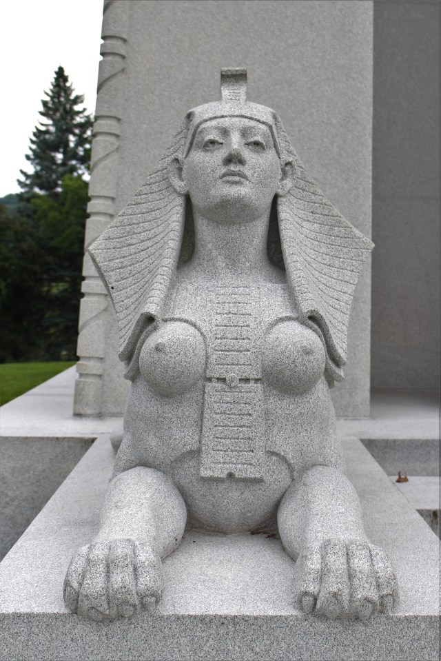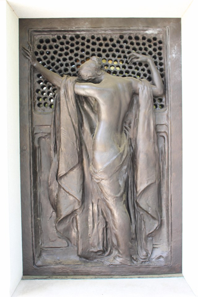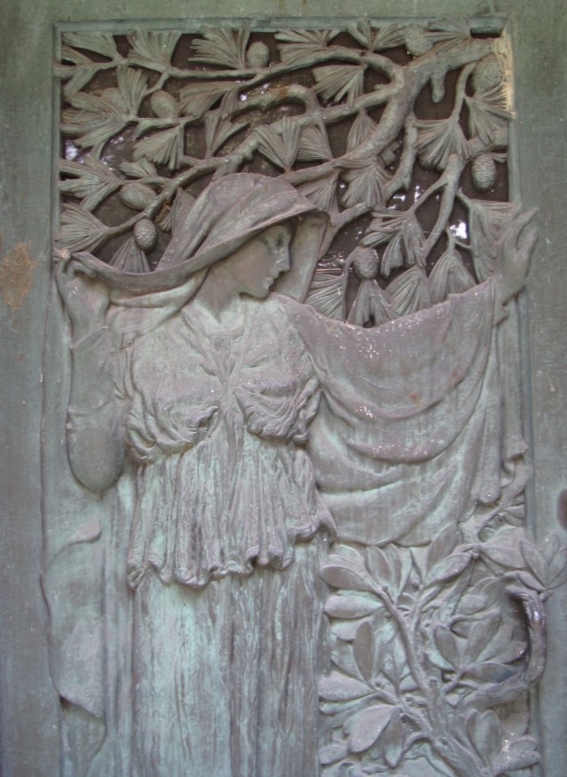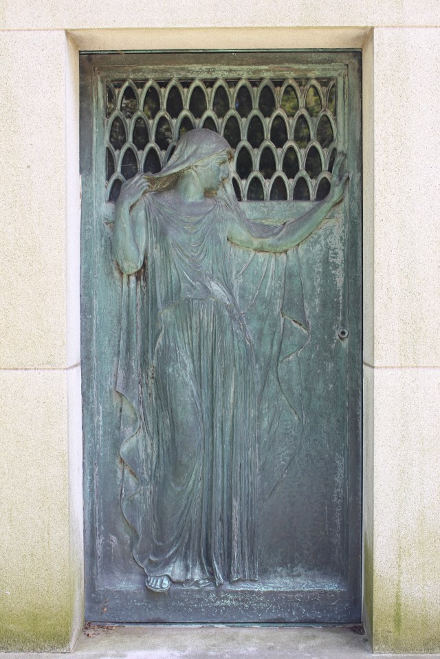 The bronze door features a classically dressed and draped mourning figure standing with her head bowed, tentatively waiting in somber silence. In David Robinson’s book, Saving Graces, he describes these figures as “grieving women who signify how deeply the deceased is missed. As symbolic mourners, their idealized beauty is spiritual, representing purity, passion, and commitment…But these women also serve as escorts on the journey ahead.