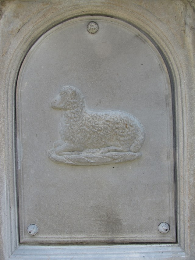 With her other hand the mourning figure is lifting part of her garment uncovering part of her face. The veil represents the partition that exists between the Earthly realm and the Heavenly one–between life and death. Again, this door has two main symbols—pine cones and leaves and laurel leaves. The bottom of this door has one additional symbol nestled in with the laurel branches—the Easter lily. The Easter lily, as a funerary symbol, has many meanings including purity, innocence, virginity, heavenly bliss, majestic beauty, and Christ’s resurrection. Christians believe that the trumpet-shaped blossoms announce the Resurrection of Jesus Christ. The Easter lily has long been associated with the Christian religion, commonly referred to as “White-Robed Apostles of Christ.” Early Christians believed that lilies sprouted where Jesus Christ’s sweat fell to the ground in the Garden of Gethsemane.