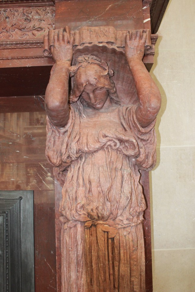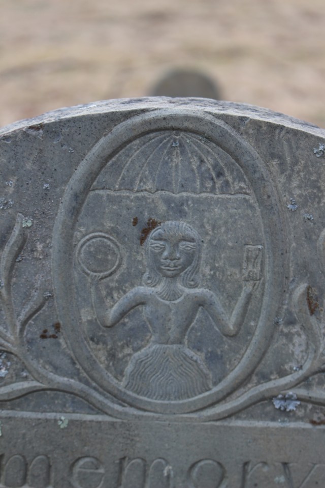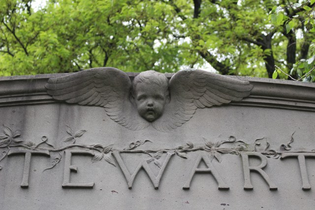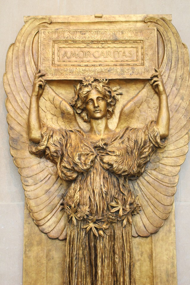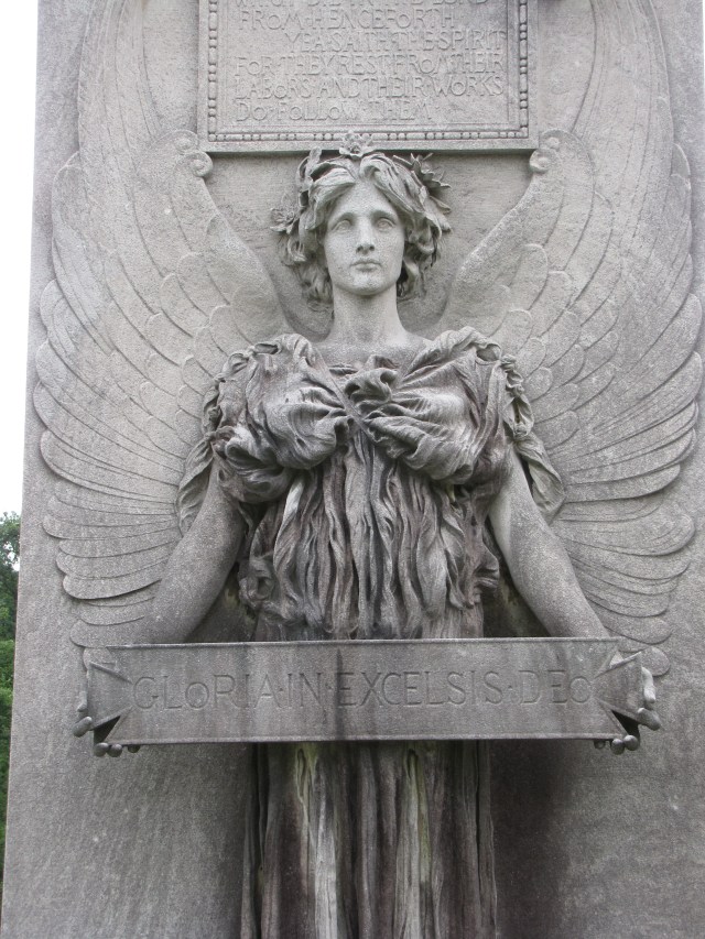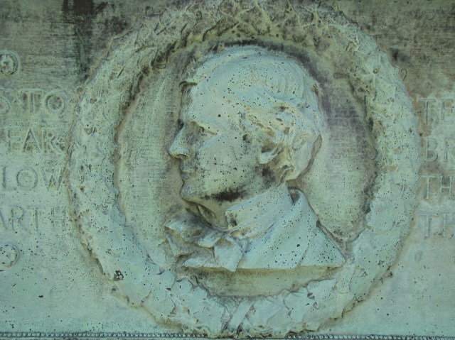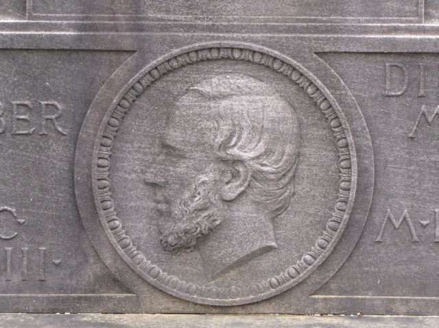 However, in the design by White, the triglyphs and rosettes have been replaced by and egg and dart design and an inset that includes a medallion bas-relief portrait of a young Tracy modeled by Saint Gaudens. The portrait draws on Saint Gaudens’s expertise as an expert cameo cutter and his ability to imbue a bas-relief with detail. The medallion portrait within an ivy wreath is flanked by the inscription: TEARS TO THEE FAR FAR BELOW THE EARTH TEARS DO I BRING TO THEE AMONG THE DEAD.