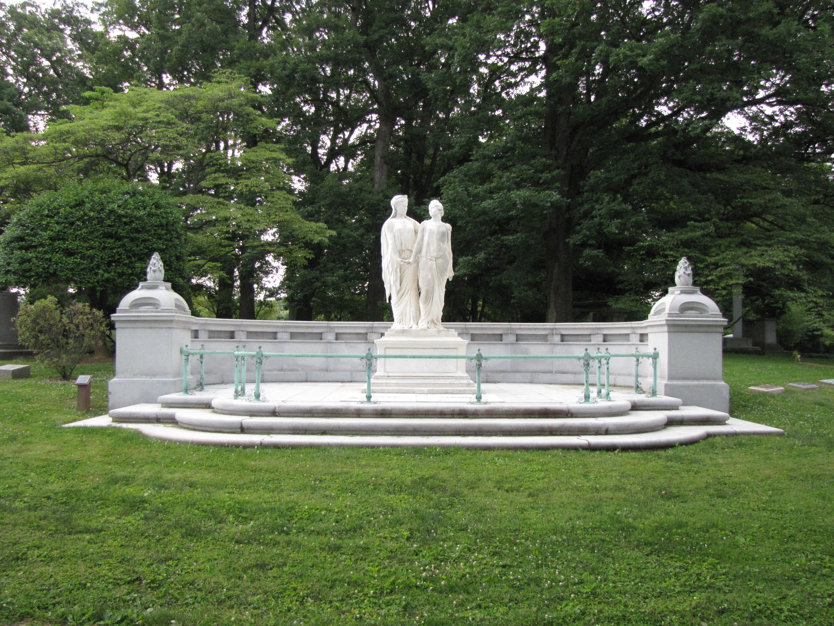 Positioned at the center of an exedra in Section 13 of the Cave Hill Cemetery at Louisville, Kentucky, stands two Greek marble statues. An exedra is a semi-circular structure, often with a bench with a high back. This type of classical architectural device was designed in antiquity to facilitate philosophical discussion and debate. In cemetery architecture the exedra is usually part of a landscape design. Here it adds to the classical design of the Caldwell monument that has as its focal point, two classical statues.